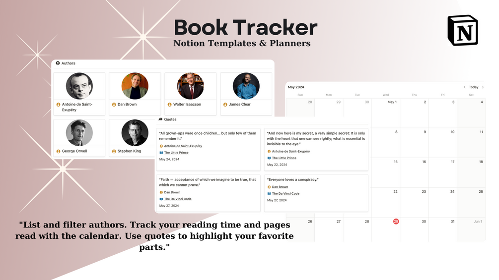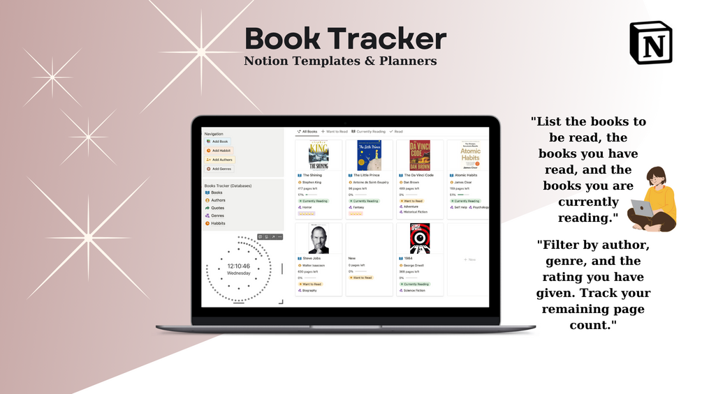 The Reading Journal Notion Template offers automatic habit tracking, calculates the pages you've read, and shows the remaining pages as a progress bar. Additionally, you'll benefit from lifetime updates, ensuring you always have access to the latest features. Plus, you can easily record quotes from your books, keeping all your favorite passages in one place. You can even rate your books with a star rating system.